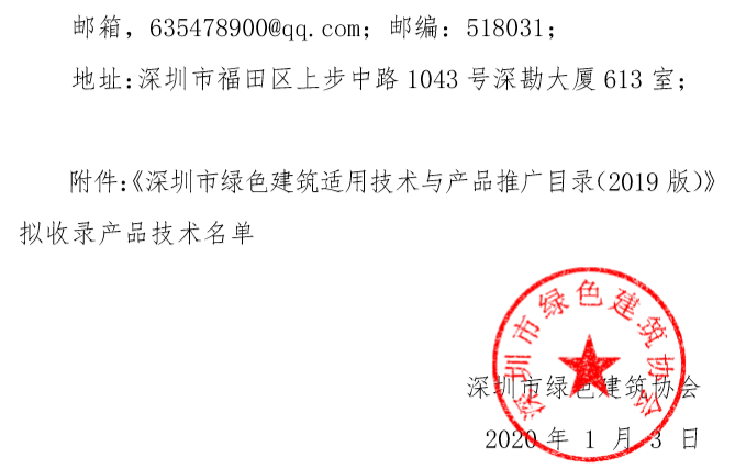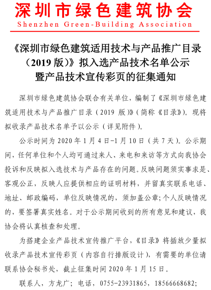 《深圳市绿色建筑适用技术与产品推广目录(2019版)》拟入选产品技术名单公告暨产品技术宣传彩页的征集通知